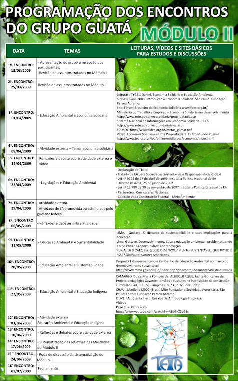 Nosso grupo, no 1º semestre de 2009, procura levantar práticas que coloquem a EA como uma alternativa à degradação tanto ambiental quanto social de nosso tempo. Em nossa programação encontram-se textos sobre Economia Solidária, Sustentabilidade, Legislações e Tratados sobre EA, bem como visitas a locais em que se pratica EA e participações em eventos que discutam os avanços e desafios para a uma mudança no cenário da educação e do meio ambiente.